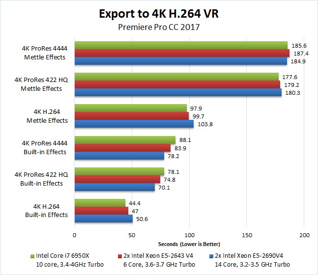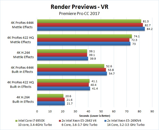 We still feel like there may be a better way to test live playback performance, but even the results from this rudimentary test are pretty clear. Without any effects applied, the Core i7 6950X was always as fast or faster than the two dual Xeon configurations. Overall, the 2x E5-2643 V4 was only able to play at the same resolution as the Core i7 6950X in seven of our ten tests and the 2x E-52690 V4 was only able to do so twice.