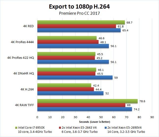 Even ignoring the price aspect, we rarely saw any benefit to using either of the dual Xeon CPUs we tested over the Core i7 6950X. There were a few times where rendering previews was faster (6K/8K RED) but for the other previews, exporting, warp stabilize, and even live playback performance going with the Core i7 6950X is clearly a better choice.