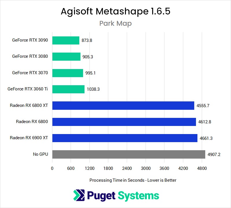 Yes – all of the GeForce RTX 30 Series cards do quite well in Metashape, and there isn't a huge performance spread so even the more afforable RTX 3070 and 3060 Ti are solid choices for this application. Moreover, we have found that pairing up two of these cards increases processing speed even further, by 5-10%, such that dual RTX 3070 cards will outperform a single RTX 3090 for less money!