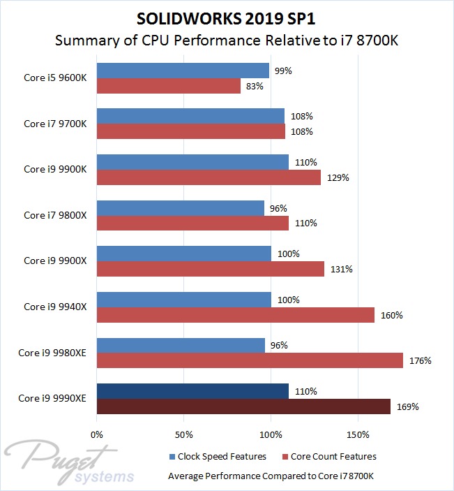 Dassault Systèmes recently updated SOLIDWORKS 2019 with its first service pack, SP1, and we did a roundup of Intel CPUs looking at how they perform in this popular engineering application. We found that both core count and clock speed play a role different aspects of SOLIDWORKS performance, so when Intel released their new Core i9 9990XE with very high clock speeds and a respectable number of cores this seemed like a good application to try on it – even though the i9 9990XE has issues that prevent it from fitting in our product line.
