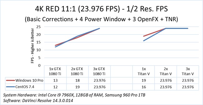 Just like in the 6K tests, Windows again has a bit of an issue with RED media using "Full Res." decode and at times is up to 6 FPS slower than CentOS. You would think that makes CentOS the clear winner, but strangely CentOS had similar issues – just with "Half Res." decode quality instead. The difference was not quite as dramatic (which is why CentOS comes out slightly on top with multiple GPUs on average), but Windows 10 was often 3-4 FPS faster than CentOS with "Half Res." decode quality.