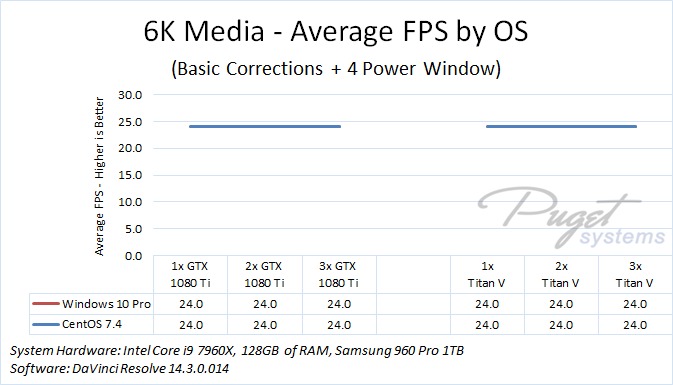 Our 6K testing is not quite as extensive as our 4K testing, but it still contains over 250 data points across four different codecs. If you tend to use just one of the codecs we tested, we highly recommend looking at just that data but for a more general take on the performance difference between Windows 10 and CentOS we again decided to average the results from each test.