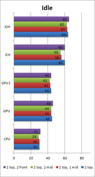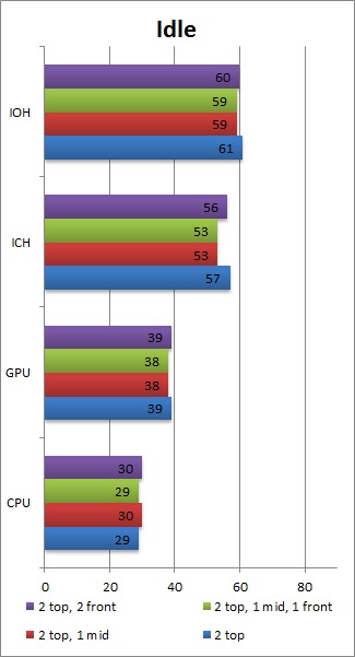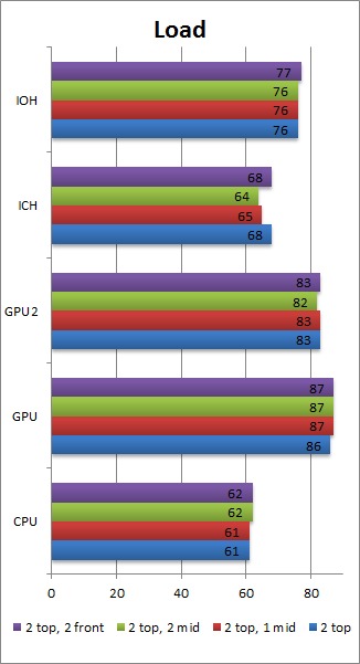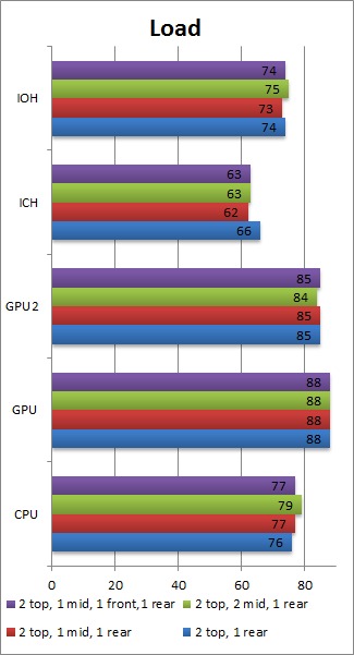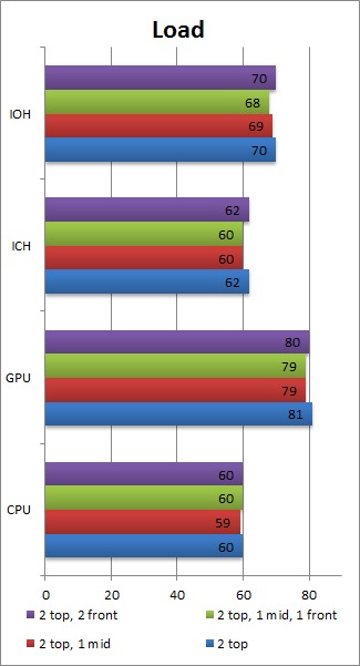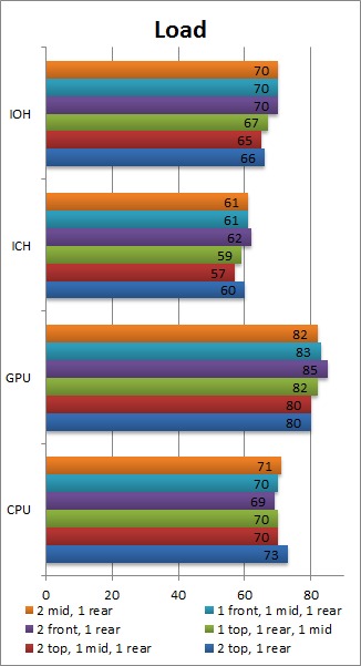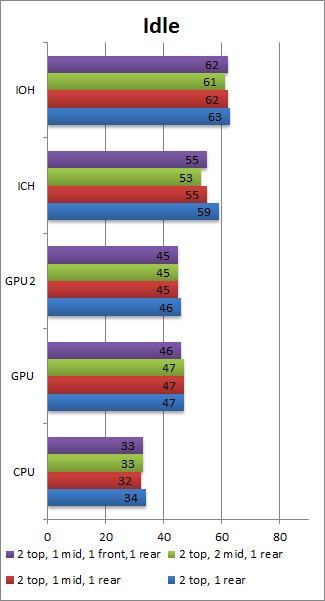 Once again, we feel that having the two top mounts, the rear mount and one extra fan in the middle mount is the best fan configuration. Interestingly, having two fans in the middle fan mounts, or having one in the front and one in the middle, results in overall higher load temperatures than just a single fan in the middle. The one degree drop in GPU temperature (which technically is within our margin of error) by having the second fan in the middle is frankly not worth the rise in CPU and motherboard temperatures.