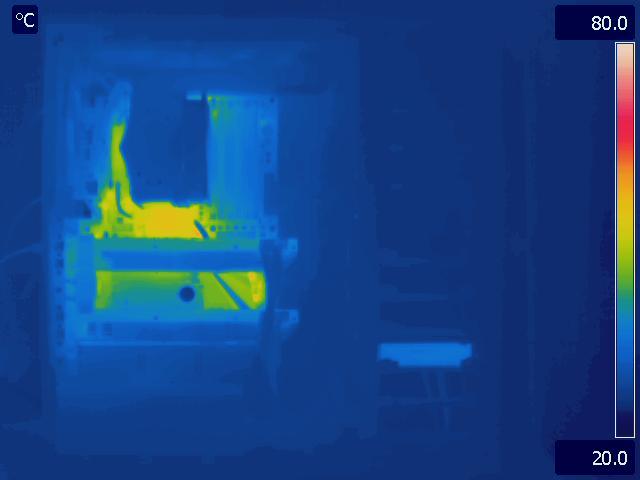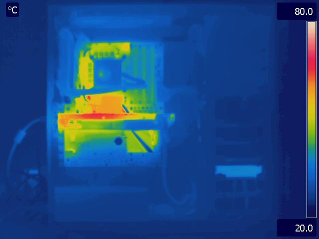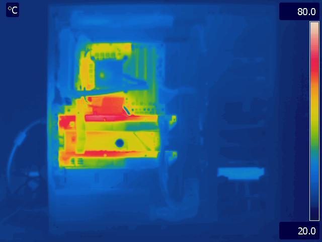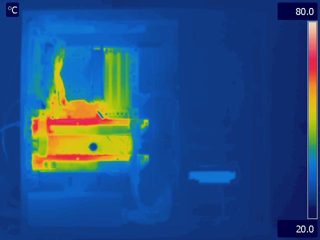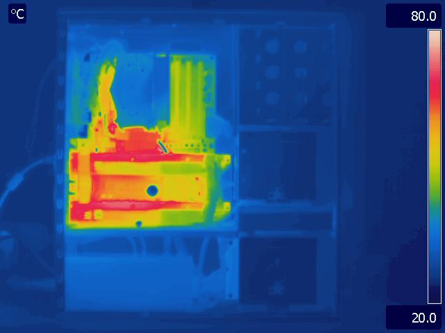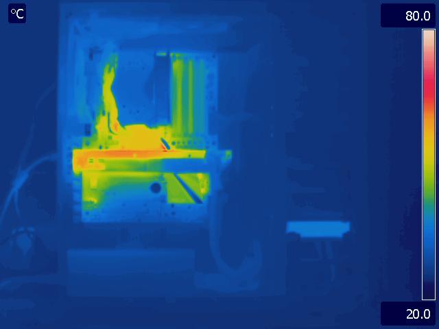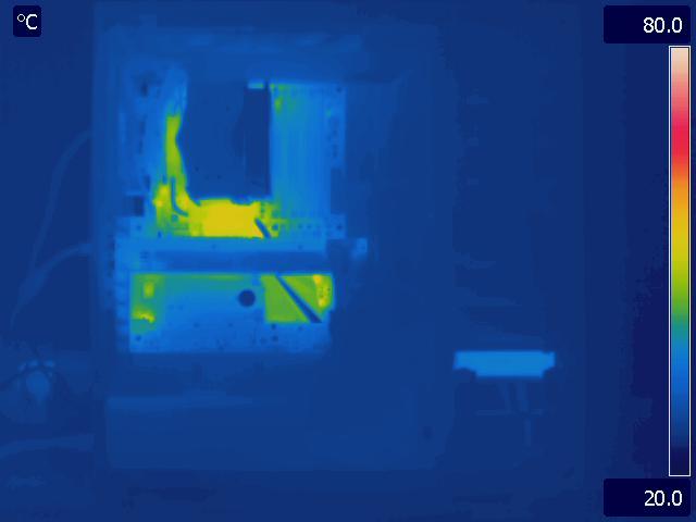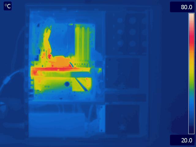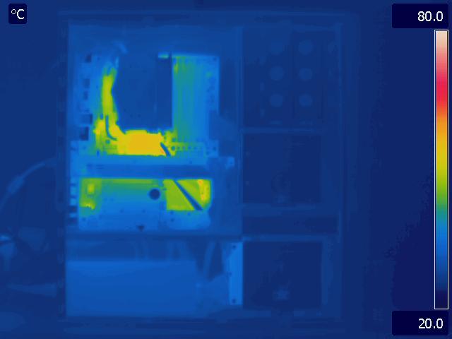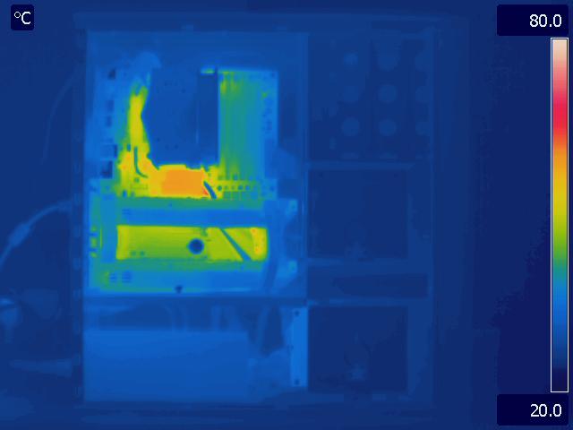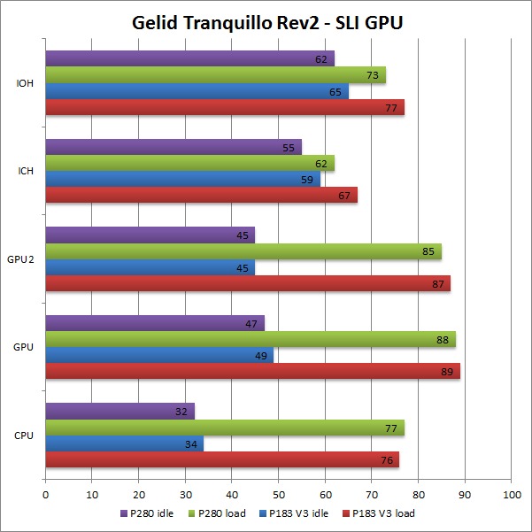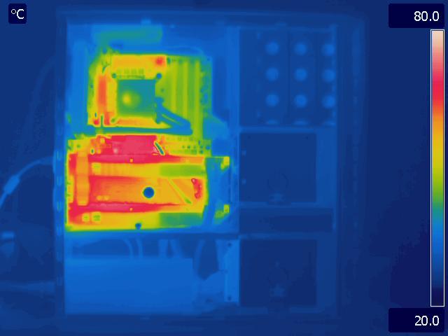 In our final configuration, we again see the same relative results that we saw in the Gelid Tranquillo Rev2 with the video cards in SLI. The motherboard and GPU run much cooler in the P280, while the CPU temperatures are identical. The hotter area around the CPU and between the video cards in the P183 V3 is also worth pointing out.