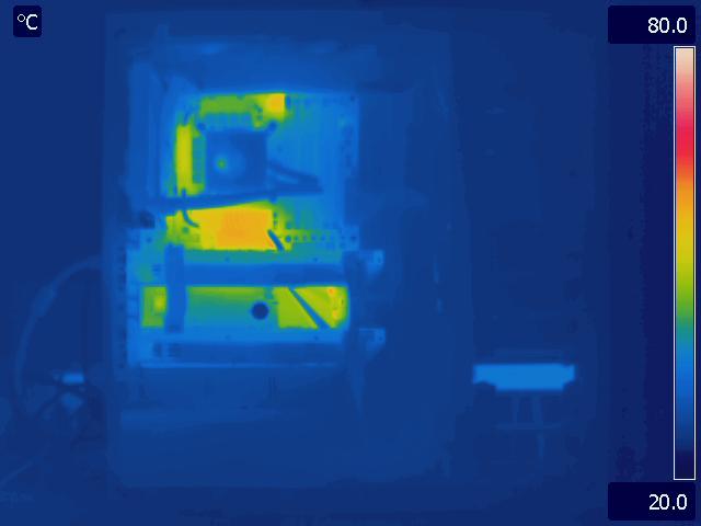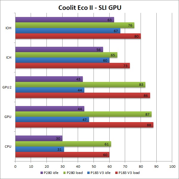 Adding a second video card gives us some results we were not expecting. This time, only the IOH and ICH sensors show substantial difference in cooling between the two chassis. While the GPU temperature readings do not show much difference, the thermal image shows us that the video cards in the P280 are in fact running much cooler. The video cards in the P183 V3 are much hotter across the entire GPU even if the temperature of the core itself is roughly the same as in the P280. This goes to show that while thermal sensors are great most of the time, they do not always show the full picture.