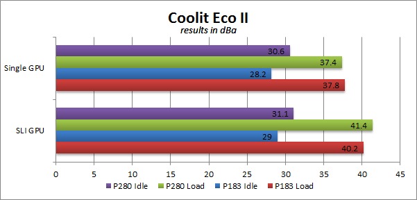 With the Coolit Eco II CPU cooler, we again see much better noise levels at idle with the Antec P183 V3. Interestingly, our load results are switched from the previous configuration. With a single GPU, the P183 V3 and P280 are close enough together to be within our margin of error. Adding the second GPU in SLI is what allows the P183 V3 to show how much the additional acoustic dampening available in that chassis helps with noise levels.