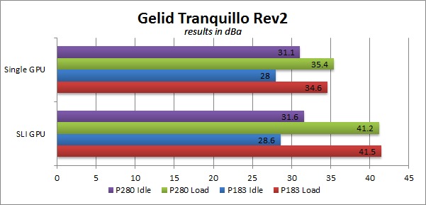 Starting with the Gelid Tranquillo Rev2 CPU cooler, the first thing to notice is how much quieter the P183 V3 is at idle. 2-3 dBa may not seem like much, but it is definitely noticeable in person. Under full load, we get a mixed set of results. With a single GPU, the P183 V3 is still quieter, but only by .6 dBa. With two GPU's in SLI, the P280 is technically quieter, although the results are close enough to fall well within our margin of error.