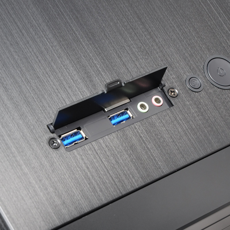 On the top of the chassis are the front ports (2x USB 3.0 and audio in/out) and the power/reset switches.The top panel can be removed by unscrewing four screws (two in the front and two on the rear), giving easy access to the front ports and switches if they ever need to be replaced.