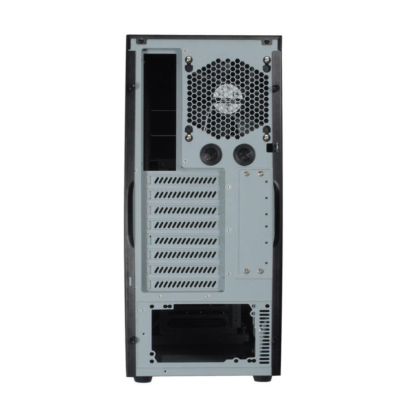 The rear of the chassis is very standard, with the rear fan screws, PCI slots and IO panel all being in the normal location as well as a pair of grommets for liquid-cooling pass through. The screws holding the tool-less PCI retention device are also accessible here if you ever want to remove the PCI retention.