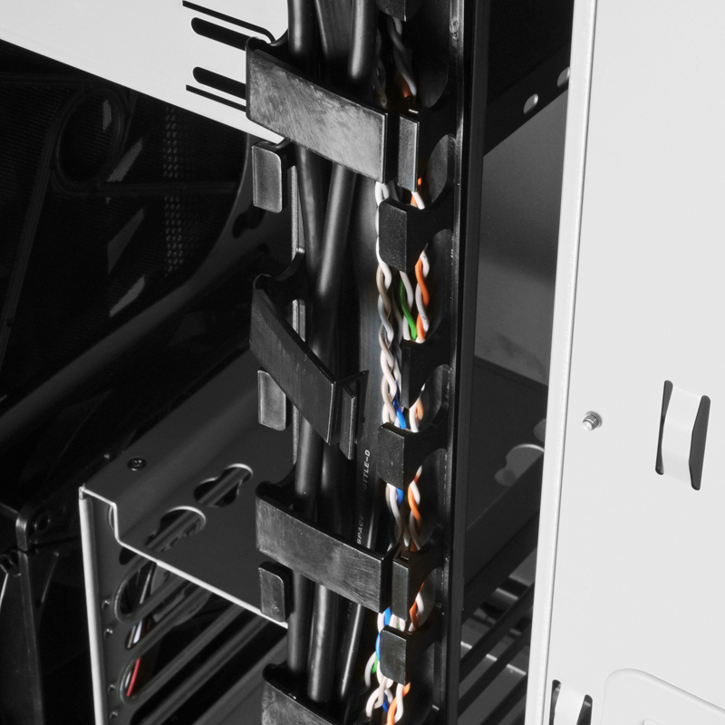 Next to the motherboard tray, there is a very nice piece of hardware for cable management that uses a series of plastic clips to hold cables in place. This easily makes up for the lack of management tabs on the motherboard tray and should allow even the most inexperienced builder to keep all of their cables neat and tidy.