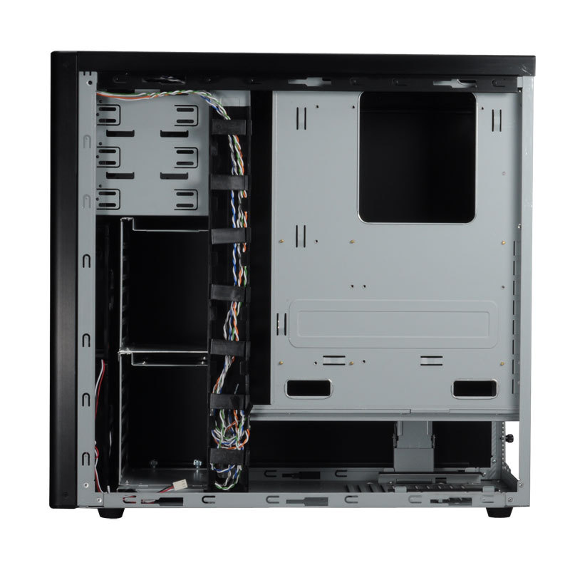 The motherboard tray is not removable, and includes just enough standoff locations for standard mini-itx, micro-ATX and ATX motherboards. There are cutouts for the CPU heatsink as well as a few at the top and bottom of the tray to assist with cable routing.