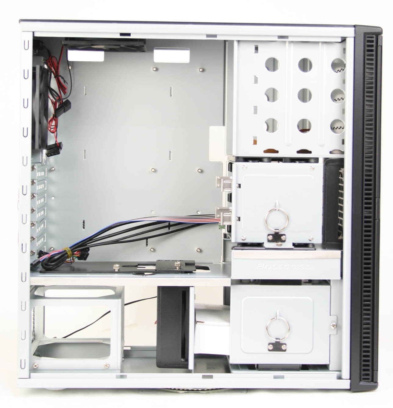 Opening the door, we see that Antec has removed a ton of plastic in an attempt to improve cooling performance in the P183. The bay covers have a slight re-design to them with the addition of pressure tabs, making them easier to install/remove. One of the unseen differences to this section of the case is the changes to the filters. In the P182, there are removable filters behind each of the square covers. In the P183, the filters are directly attached to the two doors, as well as to each bay cover.