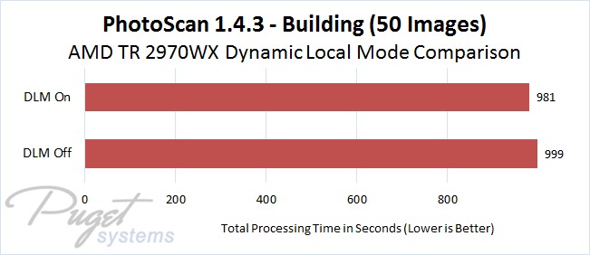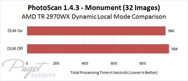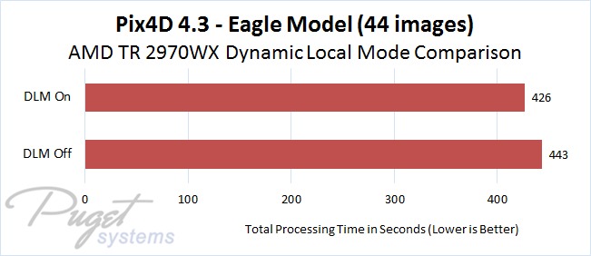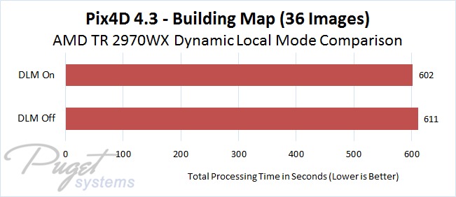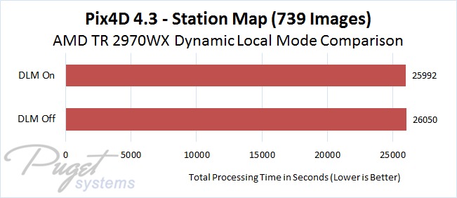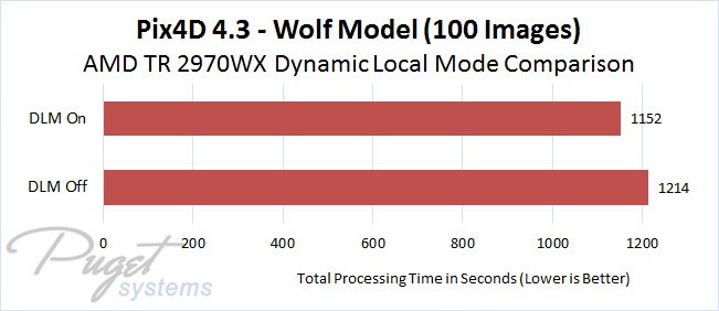 AMD's Dynamic Local Mode (DLM) feature doesn't make a massive difference in photogrammetry applications, but it does improve performance a little bit across the board in our tests. Since this is an easy setting to enable in a free application that AMD provides, it is definitely worth turning it on if you use Pix4D or PhotoScan and have a supported processor.