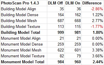 As these graphs demonstrate, there isn't a big impact from DLM – but it does help a little, across the board, in these applications. Performance improvements range from less than 1% to over 5%. It is not ground-breaking, by any means, but if you have a Threadripper 2970WX or 2990WX you will want to make sure you have DLM enabled for the fastest photogrammetry processing.
