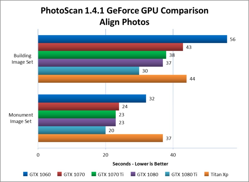PhotoScan makes use of the video card in a computer to assist with the computation of certain steps. The primary GPU accelerated steps are aligning photos and building a dense point cloud (a 3D representation of physical points that are seen from multiple angles in different photos). Because the video card plays a big role in these calculations, the model of video card (or GPU) used can have an impact on the amount of time those steps take. In this article, we are taking a look at the GeForce 1000-series – based on NVIDIA's Pascal GPU architecture – to see how they compare to each other.