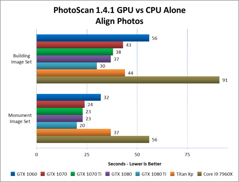 Of the GPUs we tested, which comprise almost the entire current generation of GeForce video cards, the Titan Xp was technically the fastest for building a dense point cloud in PhotoScan. Unfortunately, it was the slowest at aligning photos! Given that the GTX 1080 Ti was almost as fast at building the dense point cloud, faster at aligning photos, and costs less money, I would recommend it over the Titan Xp for the best performance. The GTX 1080, 1070, and 1060 are also perfectly fine options, at lower price points, and still offer much better performance than a CPU alone.
