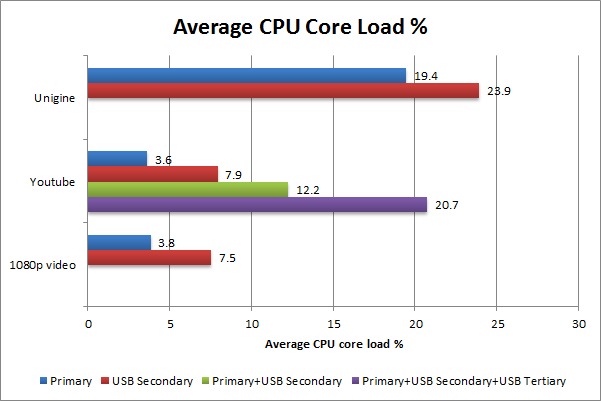 As you can see, using the USB displays certainly adds to the load on the CPU, but not by as much as we expected. Playing a movie or game on the USB display adds about 4.5% to the CPU load on our Intel 3720QM. During our Youtube testing, it appears that this 4.5% number is also a pretty accurate measurement for how much additional load is put on the CPU for each USB display.