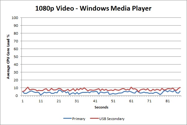 Older reviews of USB 2.0 display adapters such as Tom's Hardware's review of USB Monitors included CPU load readings for things as simple as the system idling (with and without a webpage/document open on the screen), moving the mouse cursor, or dragging a window across the screen. We are not going to include readings for these actions because, in our testing, none of those actions raised the CPU load above 0%. This is great news to start with since already we can see that this device is much more efficient than previous generation devices.