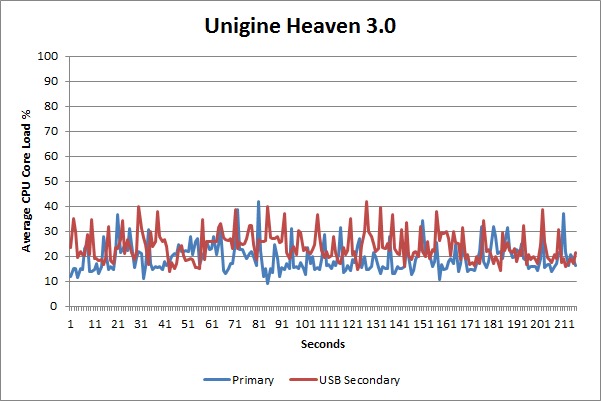 What was also surprising to us was that the Unigine Heaven 3.0 benchmark scores on the primary display and the USB DVI display were virtually identical (38.4 vs. 38.0 FPS). This suggests that as long as you have the CPU power to spare, you could do something even as intense as gaming on a USB display and have it run just as well as if you were using the ports from your video card.