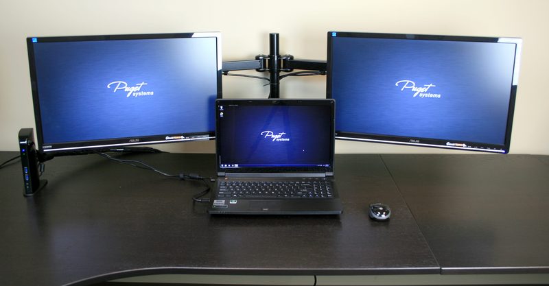 In this section, we are going to look at how much load is put on the CPU when running one or two additional displays. In our testing, we will be using a Puget Traverse 15 inch Notebook w/GT 650M with an Intel Core i7 Mobile 3720QM 2.6GHz CPU and 2x Kingston SODIMM DDR3-1600 8GB RAM. To connect to the video ports on the docking station we used a pair of Asus VW246H 24 Inch LCD Monitors. All of the displays (include the integrated laptop display) were set to a resolution of 1920×1080.