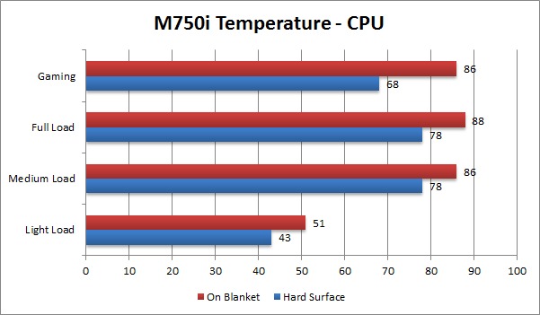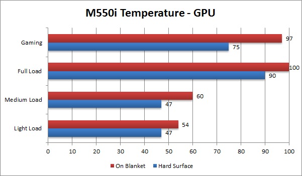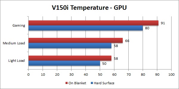 On a flat, hard surface, all five of these laptops passed the majority of our thermal testing, although the V550i, V750i and M550i started to get up into warning levels when put under a full load. As we stated earlier in this article, the V150i does not have powerful enough cooling to keep the unit under safe temperatures under full load. However, getting any system (even full desktop systems) under a 100% load on both the CPU and GPU is very rare without very deliberately causing it to happen. Because of this, the slightly high temperatures we saw under full load still pass our qualification.