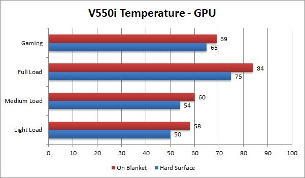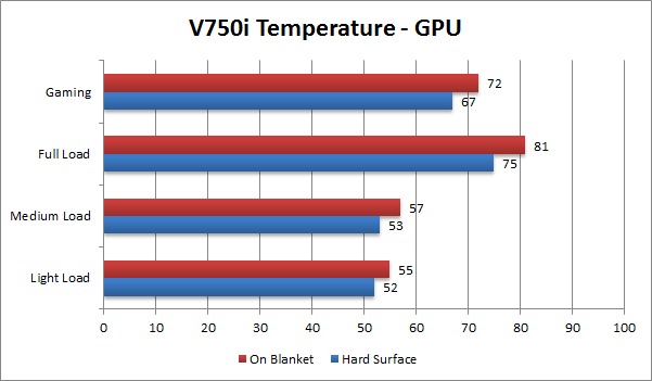 When the units were tested on a blanket, we saw a very large temperature increase at almost all load levels. All of the units still had acceptable temperatures at light and medium load, although a few of them started to get into warning levels. At full load, none of the units had temperatures we would deem safe, although the V550i, V750i and M750i had acceptable temperatures while gaming.