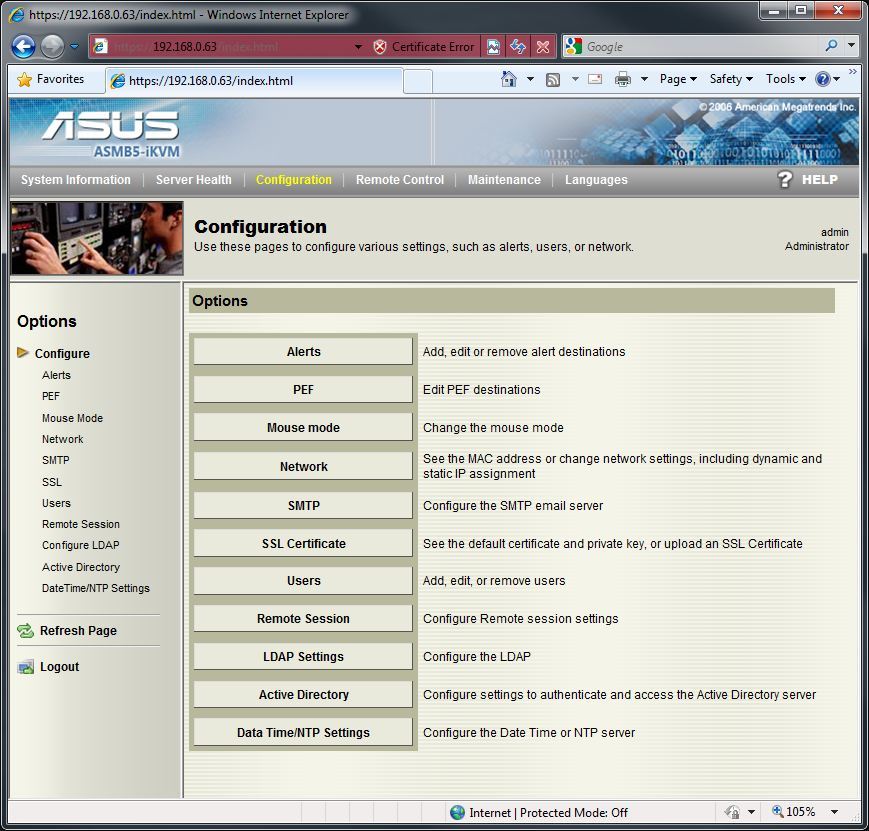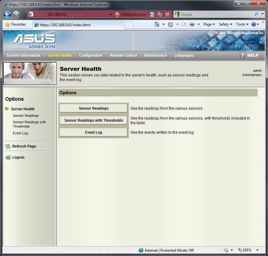 The Web Based Interface allows for a very wide range of management. You can set custom alerts, view sensor readings, remotely change the server's iKVM IP, turn on/off the server, add/delete/change users and passwords for remote access, remotely control the server and much more. It doesn't require any software to be installed beyond Internet Explorer and Java, so any Windows-based computer can remotely access the server. We will not be going through all the possible options in this article since that is covered in the ASMB5-iKVM manual, but we will quickly go through the main navigation pages.