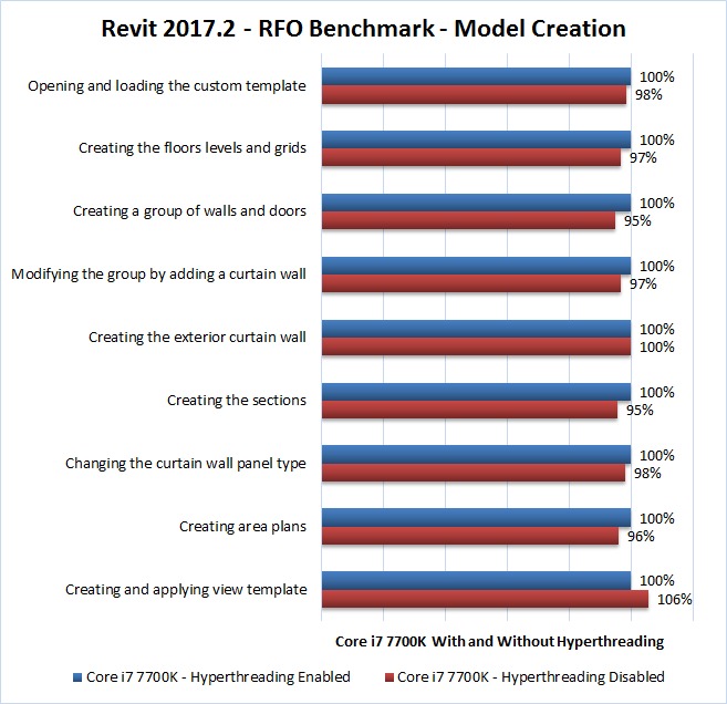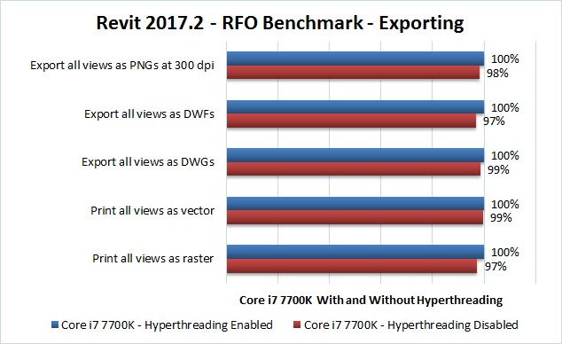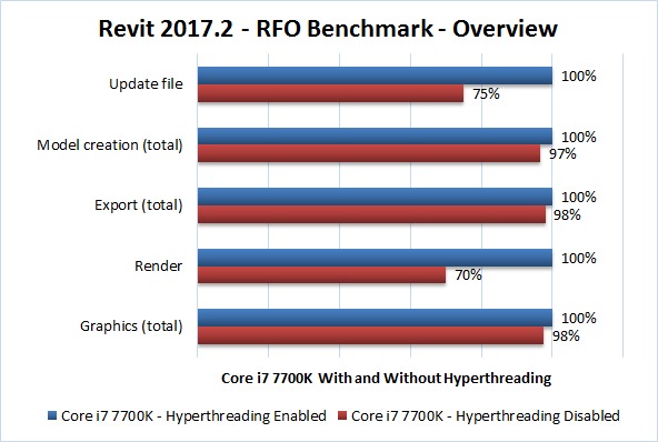 Because of this potential for trouble, testing a single processor with Hyperthreading both on (as usual) and off is helpful. In this case we used the CPU that is fastest for most Revit tasks: the Intel Core i7 7700K. Hyperthreading is easily disabled in the BIOS of most motherboards, and without changing any other settings we can get a direct head-to-head performance comparison.