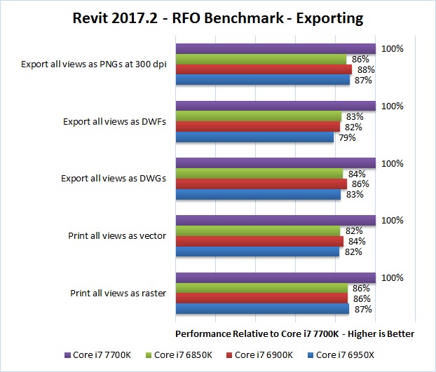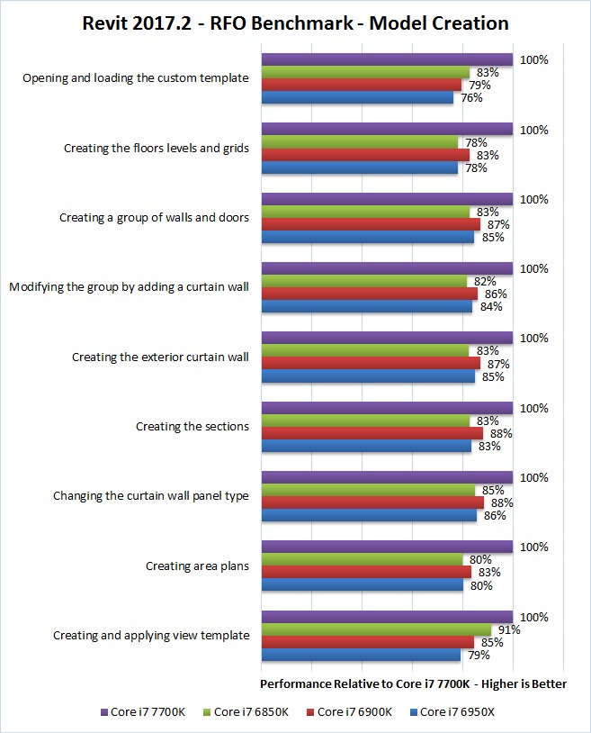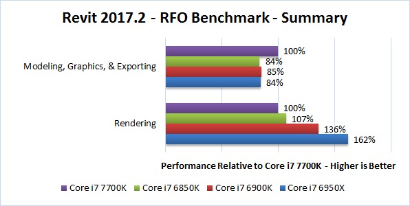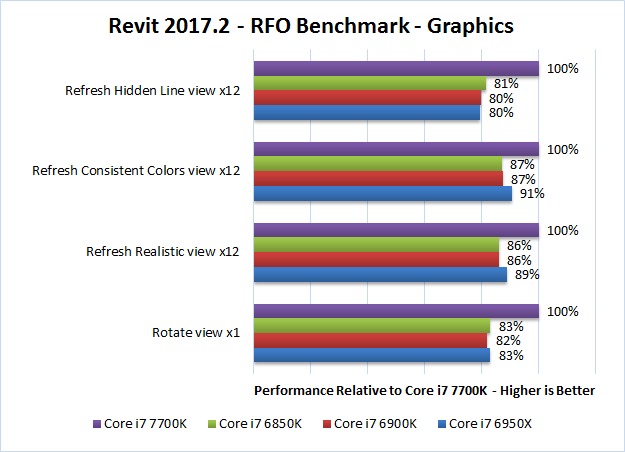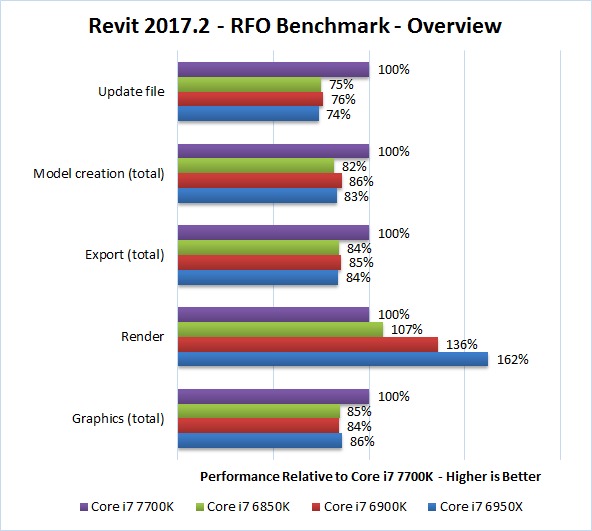 For most of the Revit workflow, clock speed is the key metric – while for rendering the CPU core count is a bigger factor (though of course clock speed still plays a role). This means that, for most Revit users, the Core i7 7700K is the way to go. Its high 4.2GHz base clock speed with Turbo Boost of up to 4.5GHz gives it a 15% lead in modeling and graphics over the higher core count models.