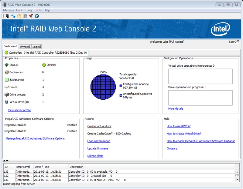 Intel provides both a command line tool as well as the Web Console 2 utility for RAID management. The Web Console 2 is a web-based GUI and from our experience is very reliable and easy to use. It allows for full customization of RAID arrays including RAID creation/deletion, RAID type, drive selection, stripe size, and I/O policies.