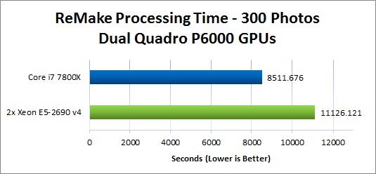 Some of the steps in ReMake are GPU accelerated, and specifically use NVIDIA's CUDA technology, so a Quadro P6000 was included in all test configurations to ensure that video card performance would have no impact on the results. If you are interested in how different video cards perform in ReMake, we have articles covering both NVIDIA's Quadro and GeForce lines.