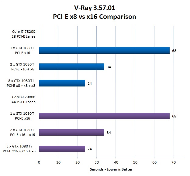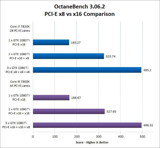 To answer this question, we are looking at the new X299 chipset and Skylake X processors from Intel. This is an ideal test case because different CPUs in this series support different numbers of PCI-Express lanes. The Core i7 7800X and 7820X both have 28 lanes, while the Core i9 7900X and higher models have 44 lanes. With a single video card both can provide the normal x16 speed, but when you move to 2 or 3 video cards, that drops – especially on the processors that only have 28 lanes.