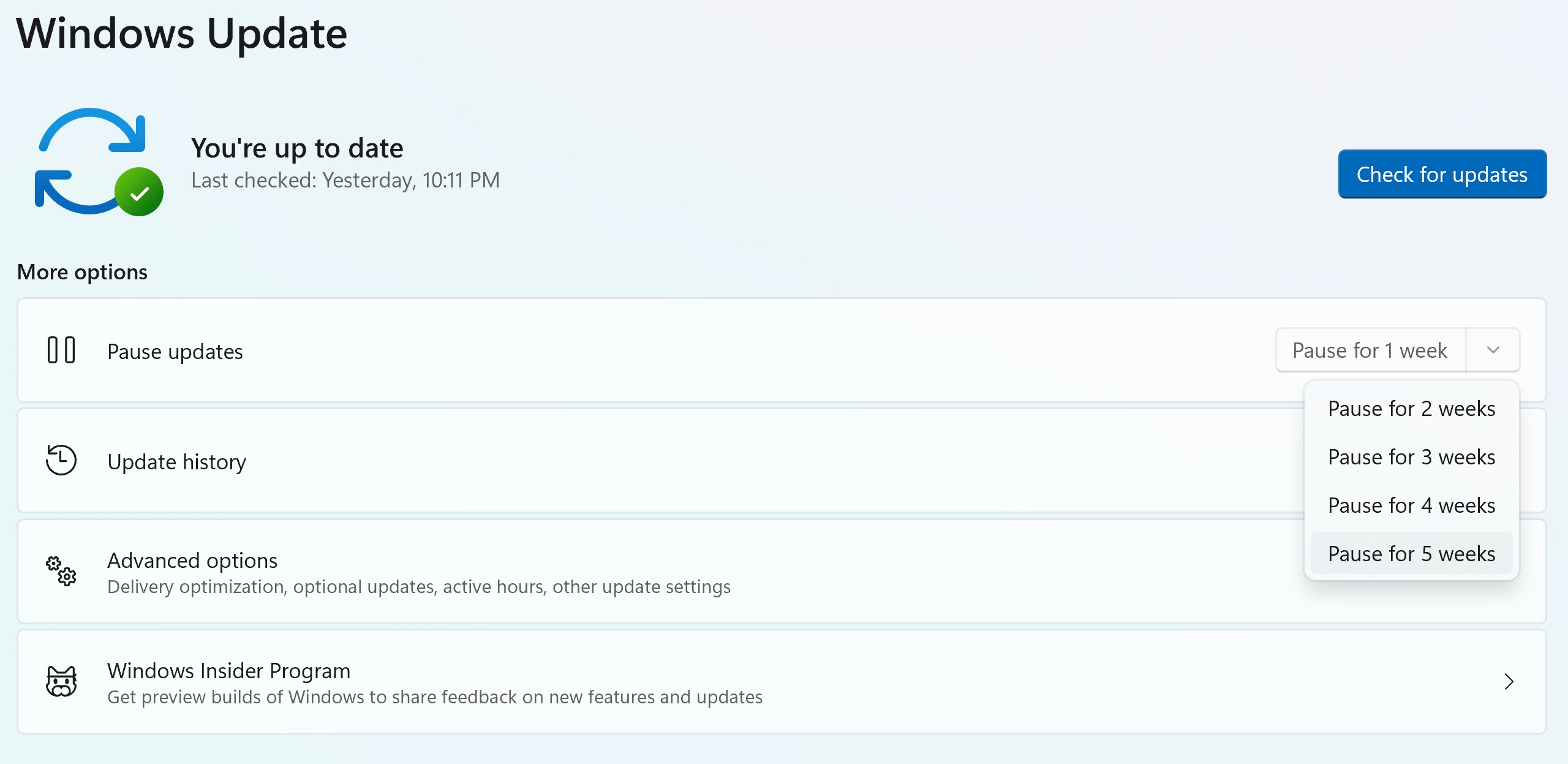 - Settings > Windows Update > Pause Updates