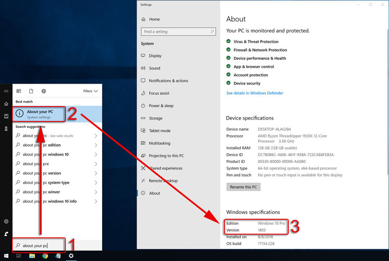 If you on Windows 10, the next step is to verify that you are using version 1703 or newer. To do so, open the Start Menu and type "About your PC". The version of Windows 10 currently installed will be listed under "Windows specifications". Note that you may need to scroll down in order to see this information.