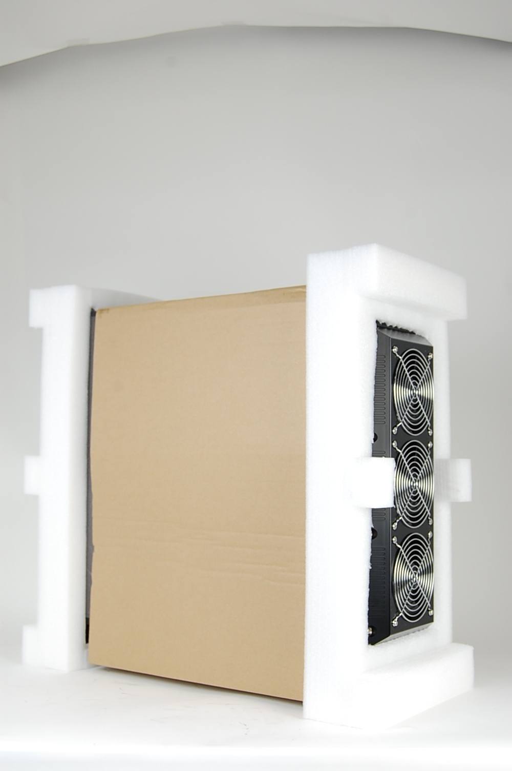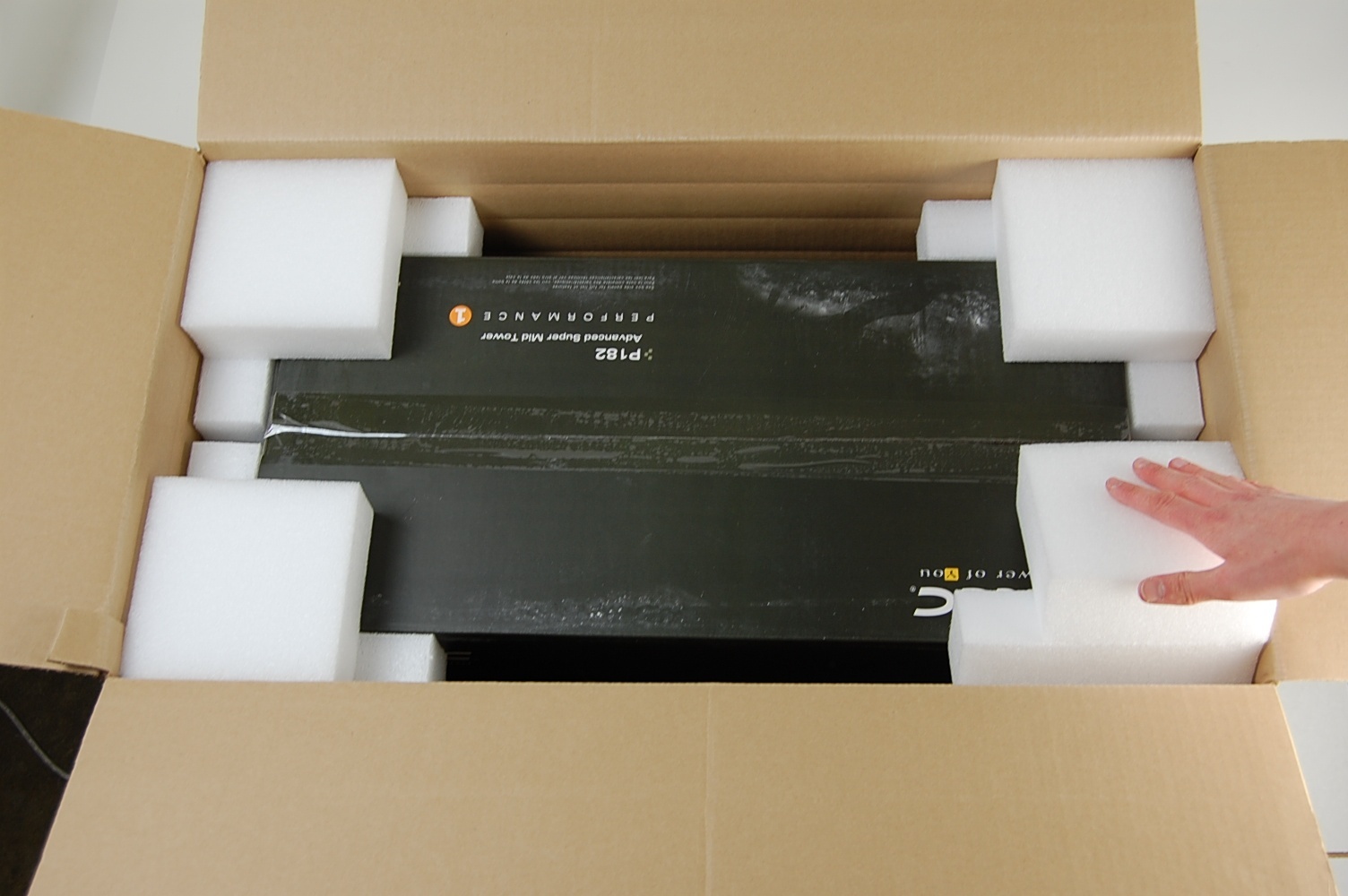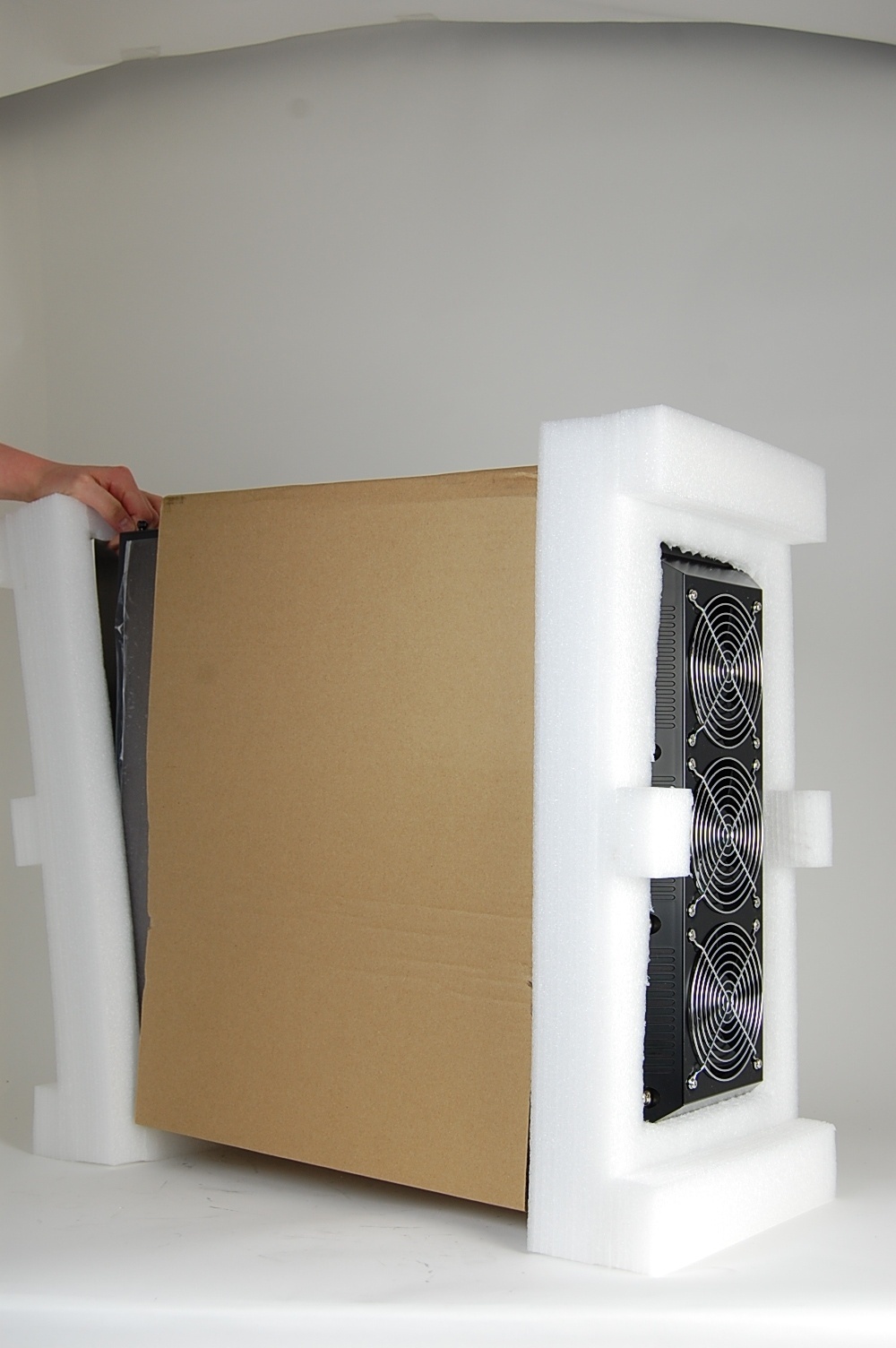 One of the foam ends has been specifically cut to fit the fans on top of the computer. Place this end on top of the computer.