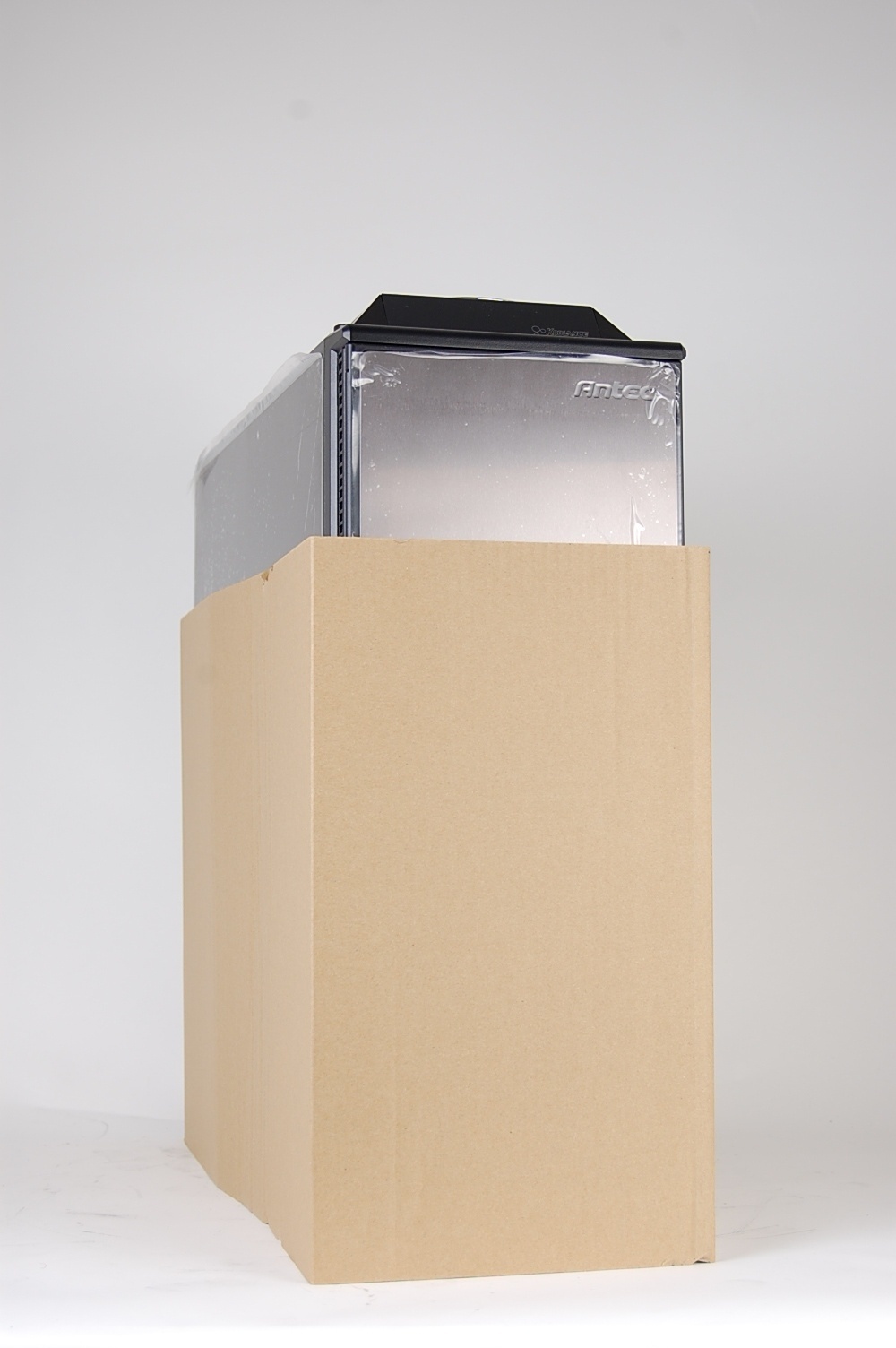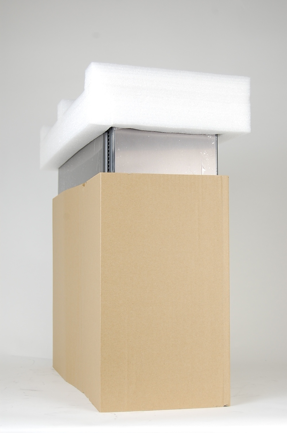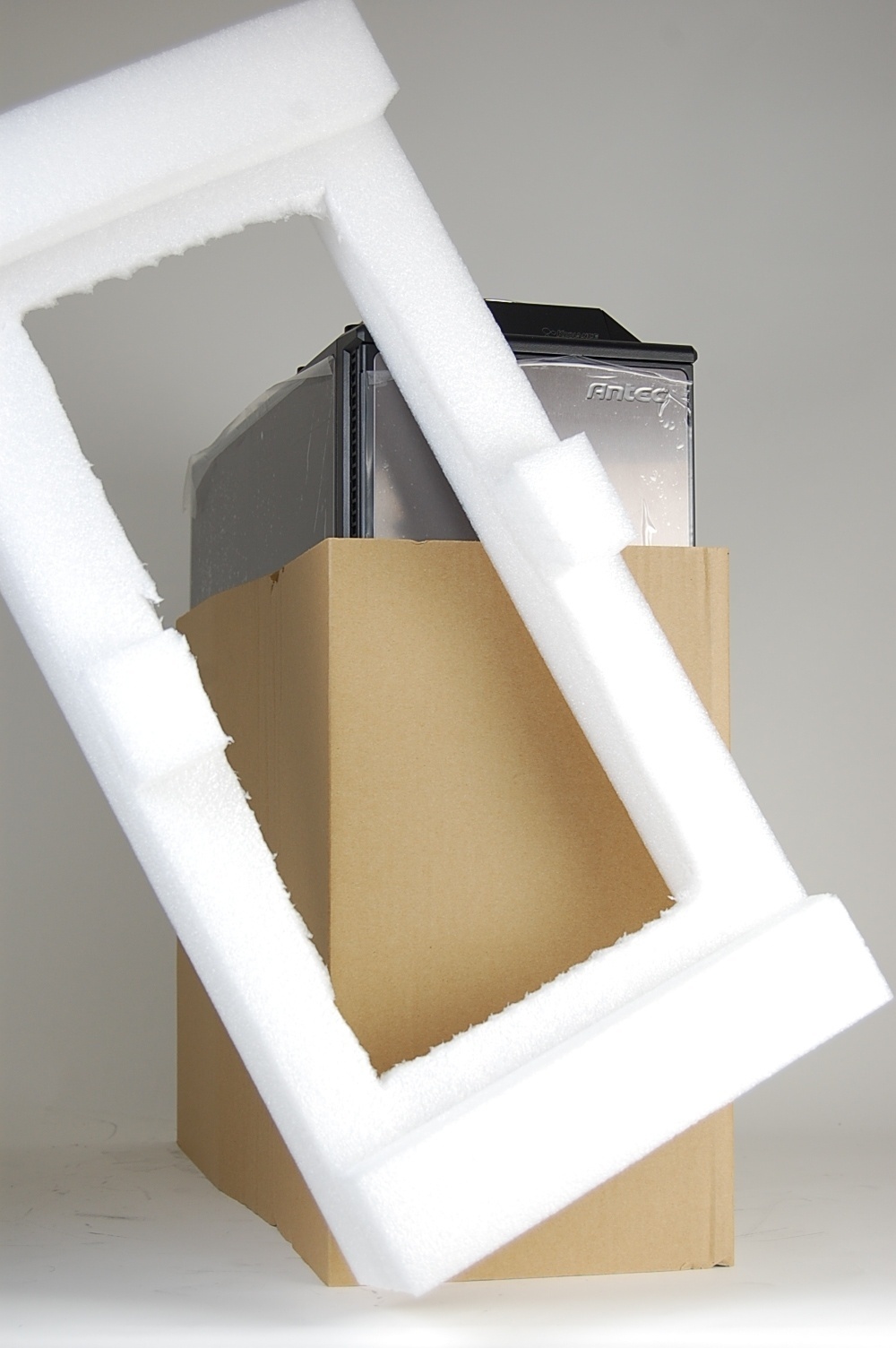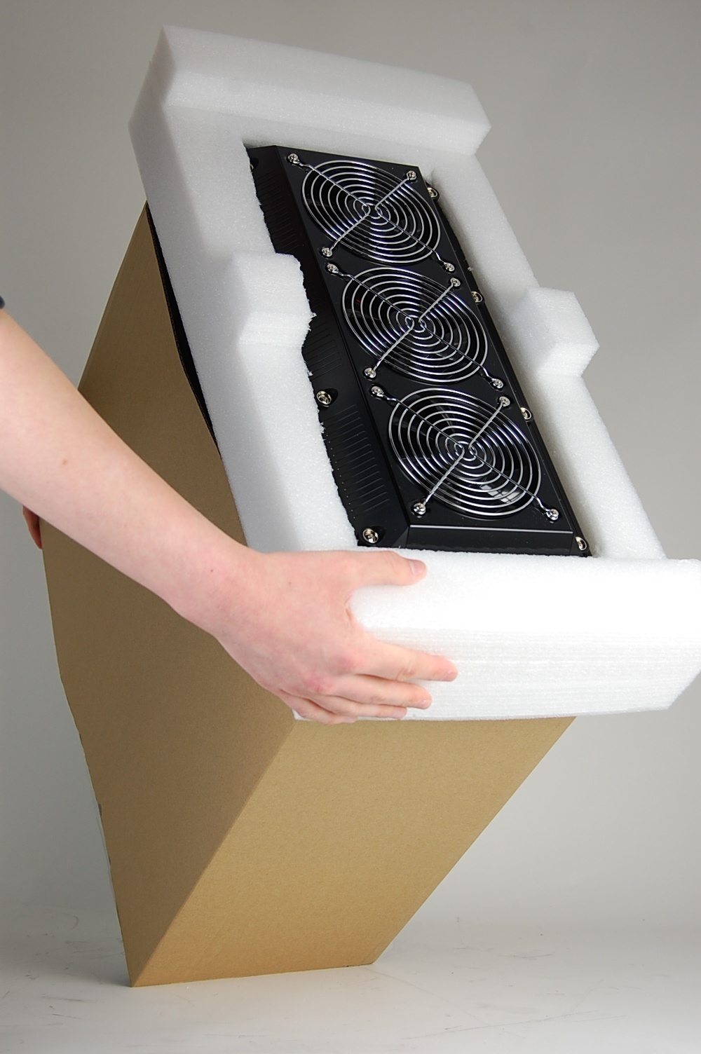One of the foam ends has been specifically cut to fit the fans on top of the computer. Place this end on top of the computer.