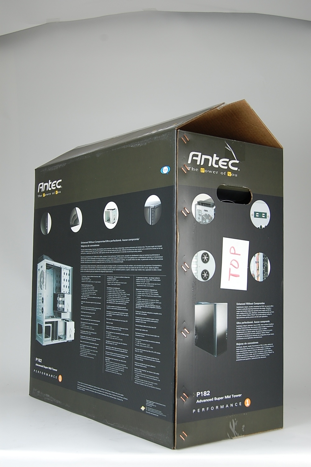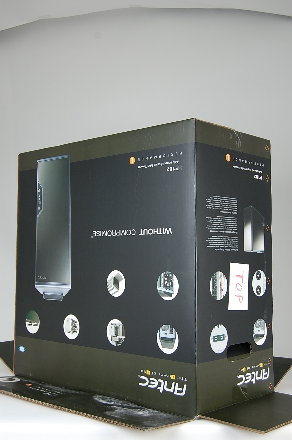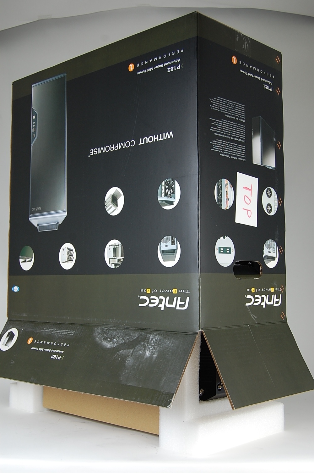 Leaving the computer door side down, put the inner box on the computer matching the “top” sticker on the inner box with the top of the computer
