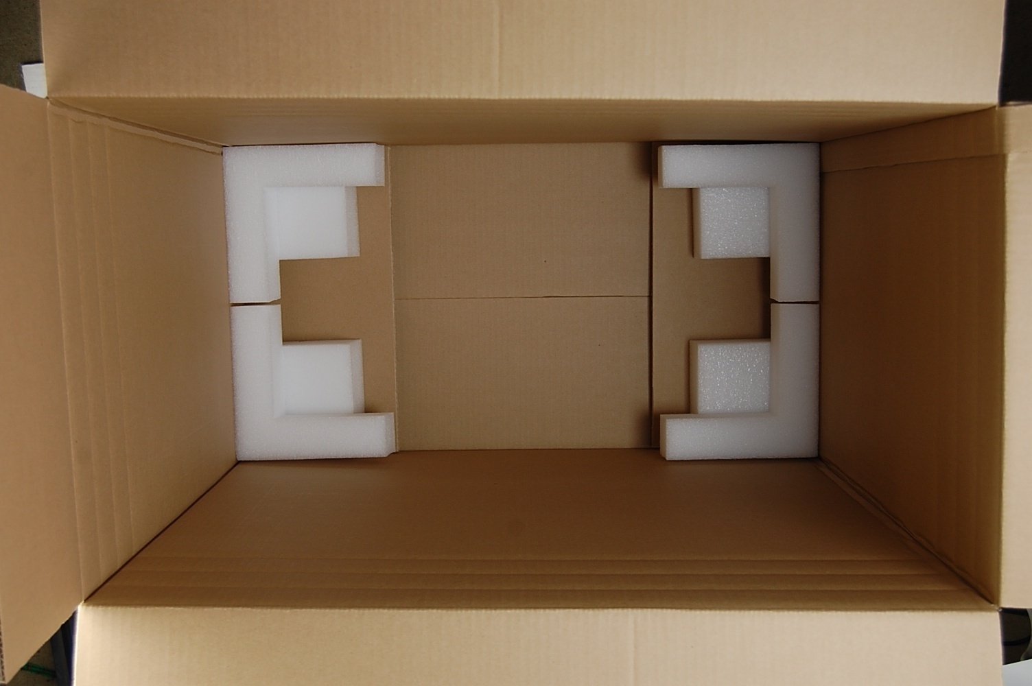 Place four foam corners in each corner of the outer box, making sure that the “L” side of the corner is facing up.