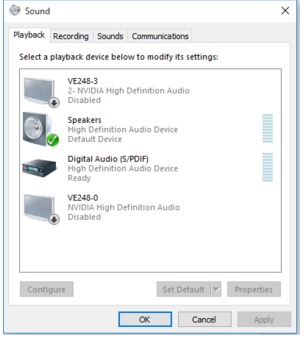 If you are unsure of which device needs to be set as default, try to think about what you are trying to achieve to narrow it down. Are you wanting sound to come out of your monitors? Then you would set the device with the monitor picture next to it as default. (The example above has two because my computer has two monitors). If you are plugging external speakers or perhaps a headset into the front panel of your computer tower, you will want to choose the option that is listed as “Speakers” or perhaps it says “Headphones” or even “Analog”.