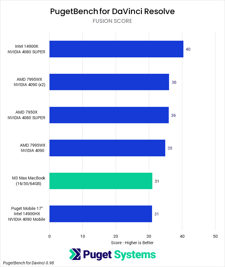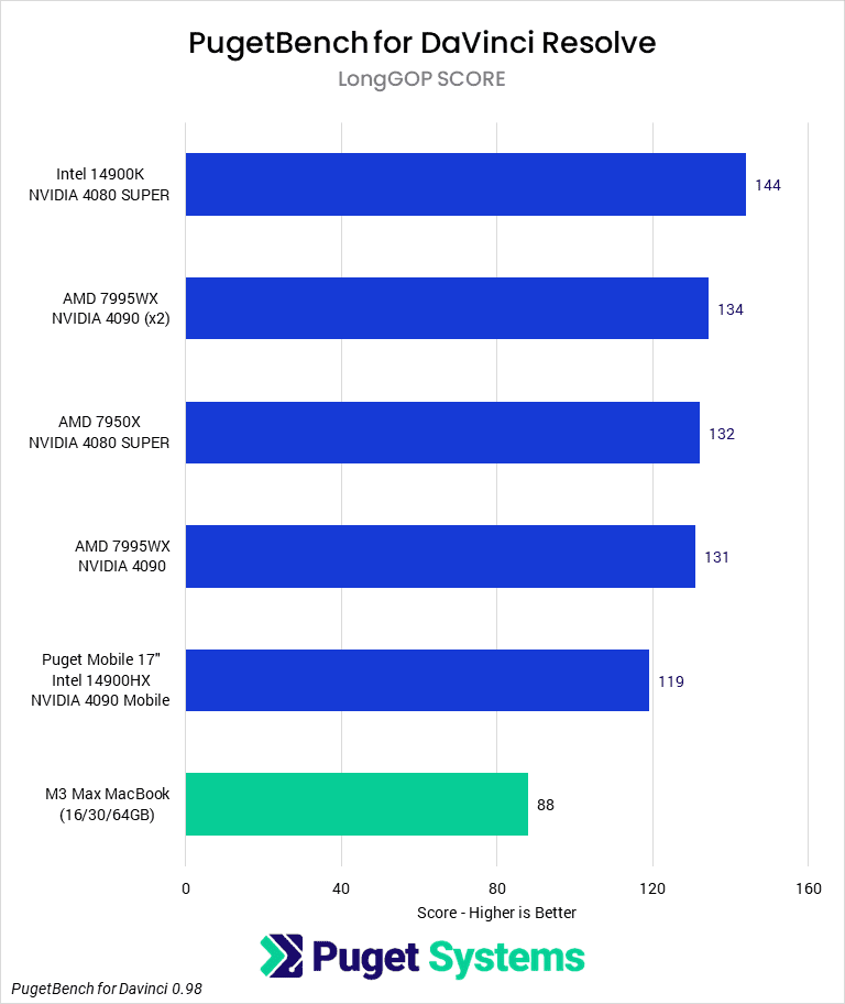 DaVinci Resolve is a strong point for PC, especially considering Apple’s solid performance in Premiere Pro and accelerator support for ProRes codecs. Even ignoring some anomalous results that we believe to be bugs, the MacBook was far behind even the Puget Mobile 17″. Ultimately, the MacBook was worse in virtually every subtest from our DaVinci Resolve benchmark, and the only area it was roughly equivalent to a PC in was when working with Intraframe codecs or doing Fusion work (although similarly priced PCs could outperform it in both). But, when a PC was faster (for GPU effects and the newer AI features in particular), it blew Apple’s offerings away.