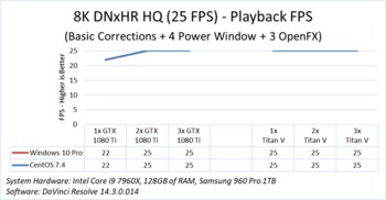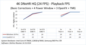 Adding 3 OpenFX effects, we see a small performance difference with a single Titan V GPU with Windows 10 coming up slightly on top by just over 1 FPS.