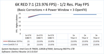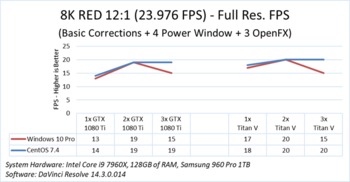 Just like in the 6K tests, Windows again has a bit of an issue with RED media using "Full Res." decode and at times is up to 6 FPS slower than CentOS. You would think that makes CentOS the clear winner, but strangely CentOS had similar issues – just with "Half Res." decode quality instead. The difference was not quite as dramatic (which is why CentOS comes out slightly on top with multiple GPUs on average), but Windows 10 was often 3-4 FPS faster than CentOS with "Half Res." decode quality.