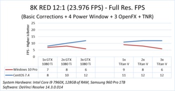 For most workloads (shown in the smaller two charts), CentOS and Windows 10 are really about on par. Windows 10 may have a slight lead, but it is small enough to not matter. With things like multiple OpenFX and TNR, however, we definitely saw a performance benefit from using Windows 10 over CentOS in some situations. It was mostly a wash with the GTX 1080 Ti, but with a single Titan V we saw on average about 2.4 FPS higher performance in Windows 10. With two Titan V GPUs we also saw a small difference, but that was only by less than a single FPS.