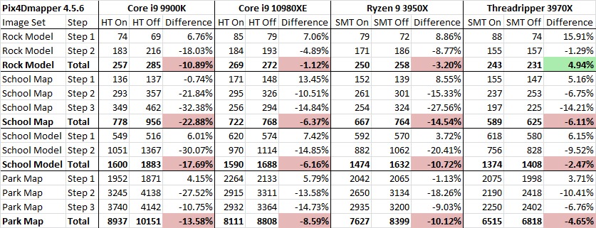 In all but one of our tests, having Hyperthreading or Simultaneous Multithreading turned on resulted in the best performance. The only place where disabling those off helped was with the smallest image set on the Threadripper 3970X, and the modest gain there was more than offset by losing performance with all three larger image sets. Other photogrammetry programs may behave differently with these features, but in the case of Pix4D it is clear that leaving HT and SMT enabled is the way to go.