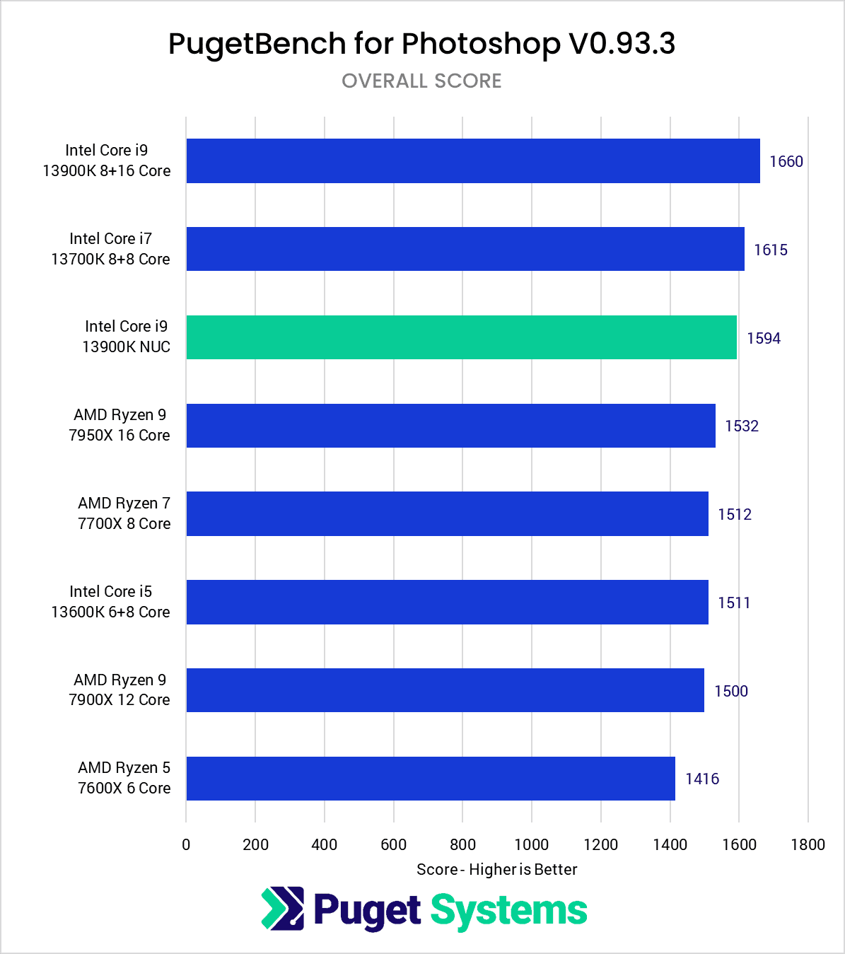 In Adobe Premiere Pro, the NUC moves up a few spots on our performance charts – ending up with an overall score that is just 3% behind the desktop 13900K system. This places it right in between the 13900K and 13700K in a traditional desktop, meaning that you are only giving up a small amount of performance in order to be in a much more compact package.