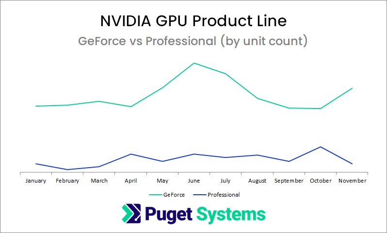 We use exclusively NVIDIA graphics cards these days, but it is interesting to look at the breakdown between their mainstream GeForce line and their “professional” grade cards. That second group used to be consolidated under the Quadro brand name, but recently NVIDIA has dropped that naming from new products – so the chart below includes both Quadros and the newer RTX A-series: