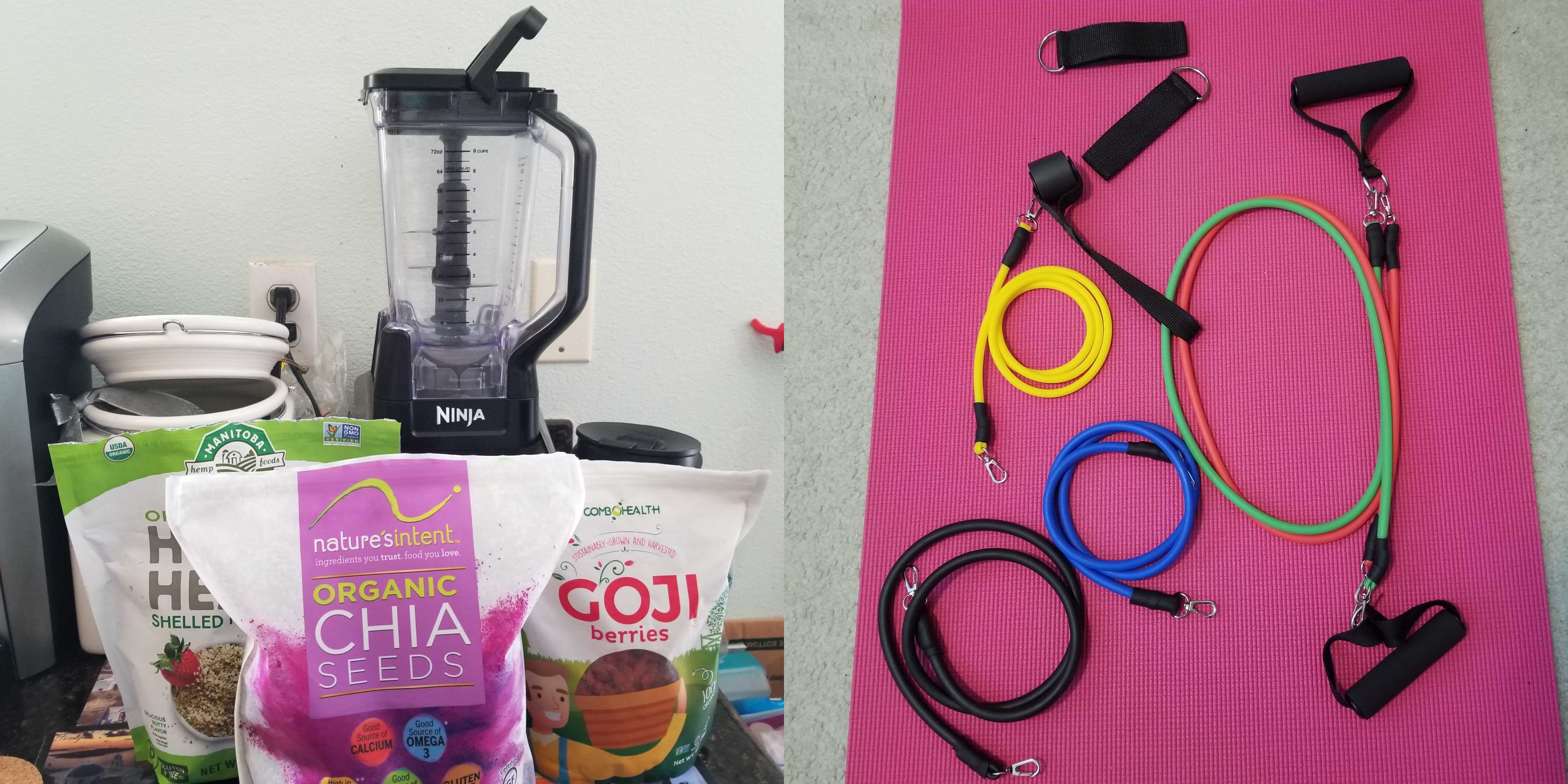 In place of Jamba Juice, we broke out the Ninja blender that was collecting dust in our pantry. In place of overly sugary smoothies, homemade smoothies made from frozen fruits, vitamins, protein supplements, and other healthy add ons I don't know how to pronounce or understand, have become my go to after a workout. Heavy bars, dumbbells, and loud grunts have been replaced with stretchy bands and follow-along YouTube workouts.