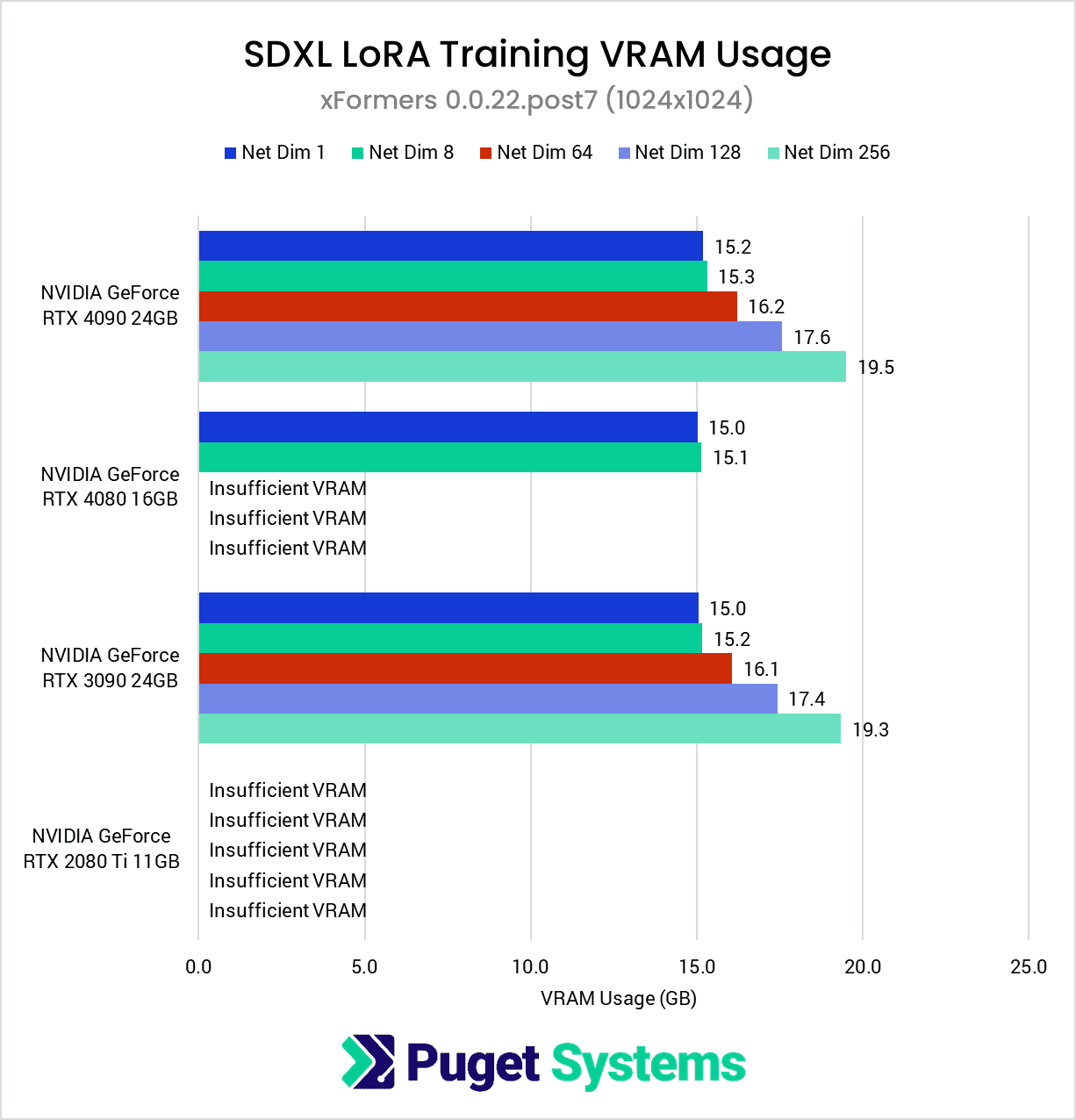 These results show that consumer-grade GPUs are capable of training LoRas, especially when working with smaller resolutions like 512×512, which is the default for SD1.5. However, when training using higher-resolution images, such as 1024×1024 for SDXL, we quickly begin to run into VRAM limitations on GPUs with less than 24GB of VRAM.