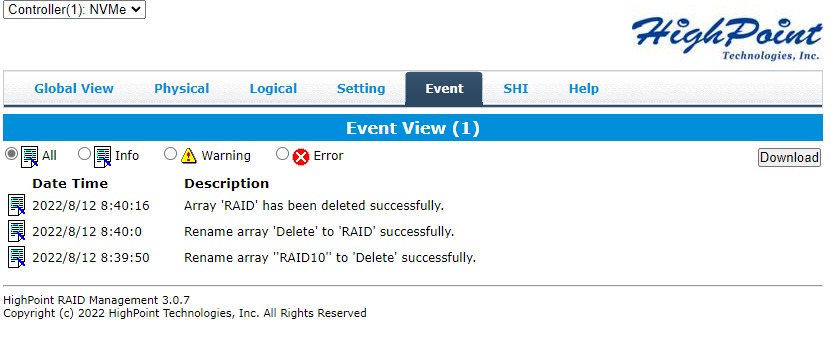 It can be useful to check the Event tab on occasion and especially if you have a critical status reported by the logical disk or other symptoms related to irregular storage performance. You can download a log file and clear all log entries within this tab. By itself, the Event view won't usually provide the full picture – so it is useful to supplement with the SHI tab's information or other storage monitoring tools to view SMART errors. Keep in mind that most info and even some of the warning events are part of normal operation.