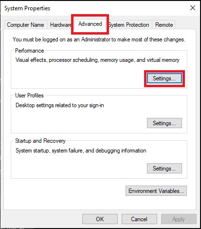 If you want to take a look at your own pagefile settings, launch sysdm.cpl from the Start menu search or run box (Win+R) and navigate to Advanced –> Settings –> Advanced –> Change.